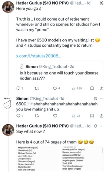 My favorite part of this social media meltdown isn’t Hatler trying to import slaves, no it’s the fact that he claims to have over 6500 people waiting to get the AIDS, I mean, work with him. LOL. Dude has literally shot like 20 paid scenes, and more than half have come from Casting Couch Powers. But this drug addict wants people to think he’s got a 6500 person waiting list.