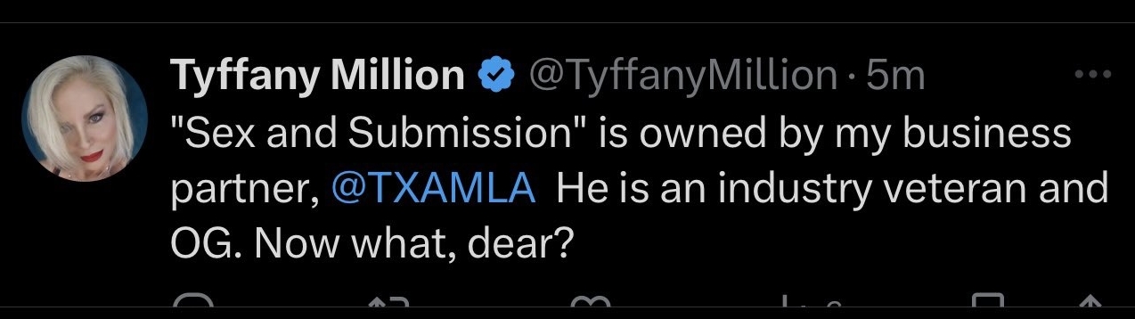@TXAMLA would be the account of Ben Fisher, partner to Tyffany Million of GLOW, and in the Hall of Fame. So, according to Tiffany, Ben owns Sex And Submission. This is like when Nick Boner said his dad owned the LA Coliseum. Bonus points if you know who Nick Boner is. Grrrrrrrr.